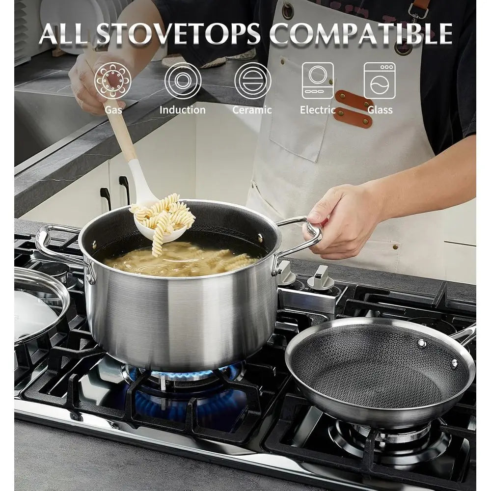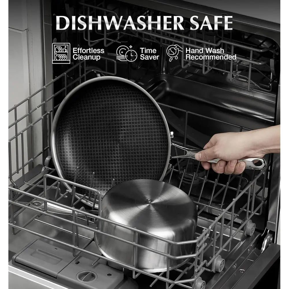 Easy to Clean & Maintain: The premium three-layer stainless construction ensures durability and effortless cleaning. The smooth, hybrid eyecomb interior resists food buildup, making maintenance a breeze. Built to last, this stain-resistant cookware set retains its performance and shine, even after frequent use.