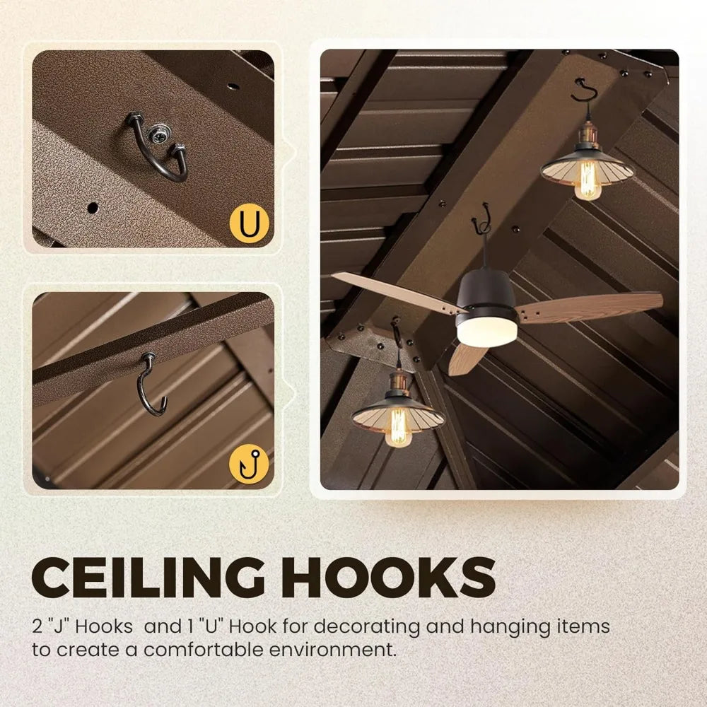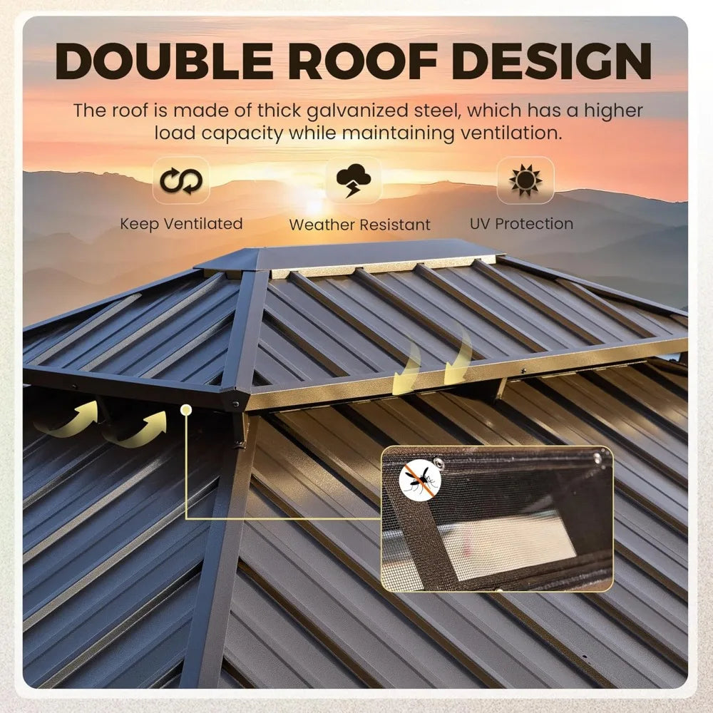 - 【Galvanized Steel & Double-roof】- This patio gazebo has a double-layer galvanized steel roof that offers great ventilation and airflow. Its sturdy construction provides protection against wind, rain, and snow, while the galvanized steel material ensures thermal insulation, waterproofing, and noise reduction.
