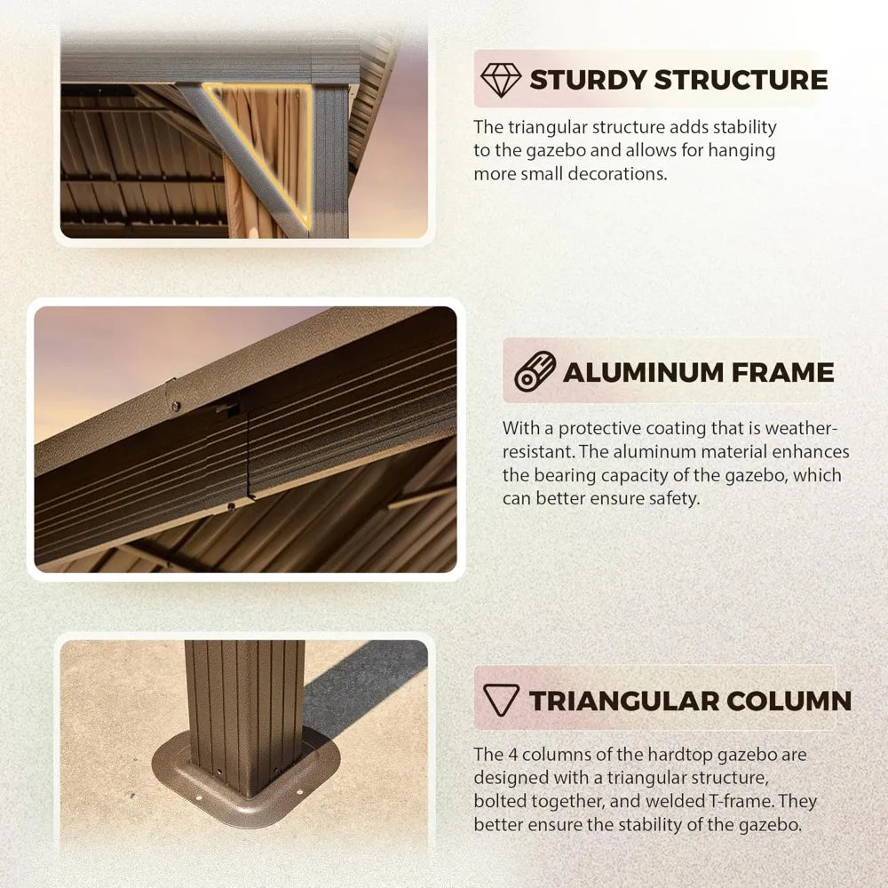 - 【Aluminum Frame】 - Sturdy permanent hardtop gazebo built with triangular powder-coated aluminum frames, which are more stable and durable than the standard. The 10x10 gazebo with pre-drilled bases is designed for various kinds of ground and can be installed in different outdoor situations.