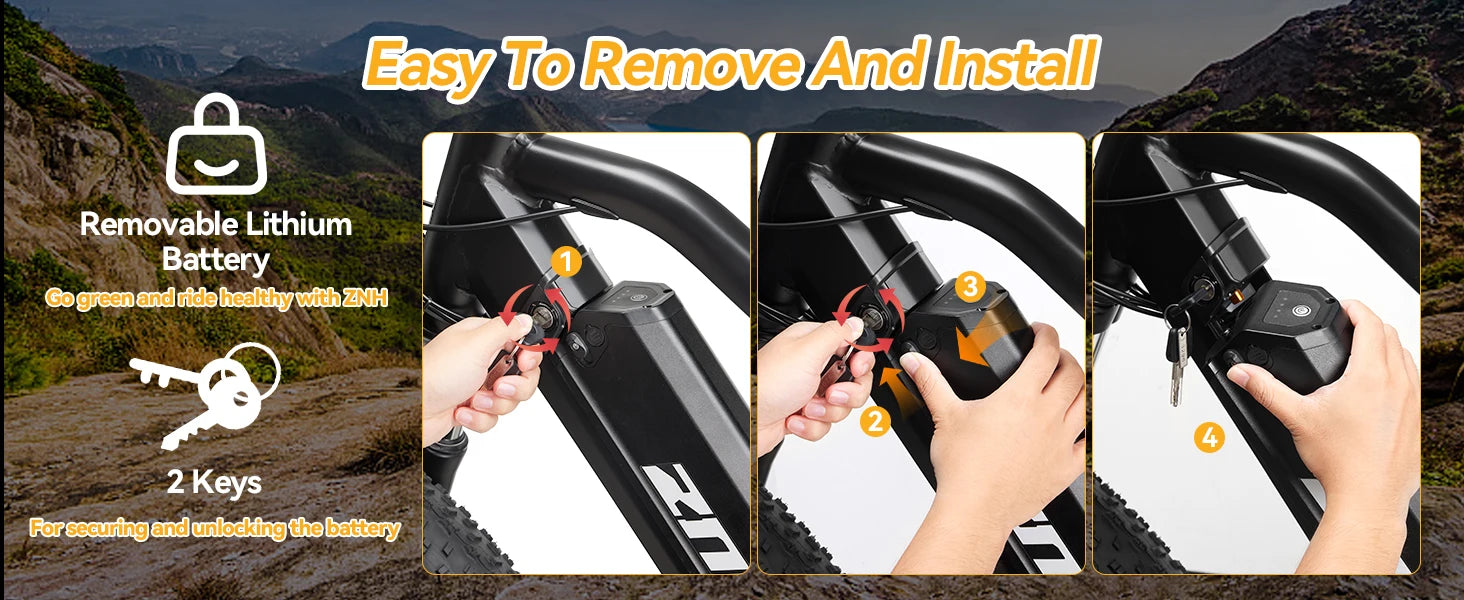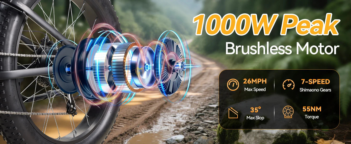 Powerful Brushless Motor: Equipped with a peak 1000W motor and 55Nm of torque, this electric bicycle reaches speeds up to 26MPH and conquers inclines up to 35°, perfect for city roads and off-road adventures.