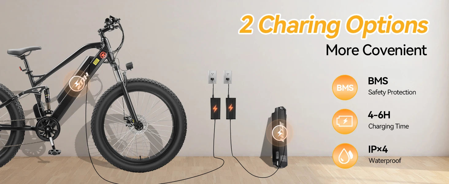 Long-Lasting Battery: The UL2849-certified 48V 13Ah removable battery with BMS protection ensures safe charging and a riding range of 35–50 miles per charge. Fully charges in just 4–6 hours.