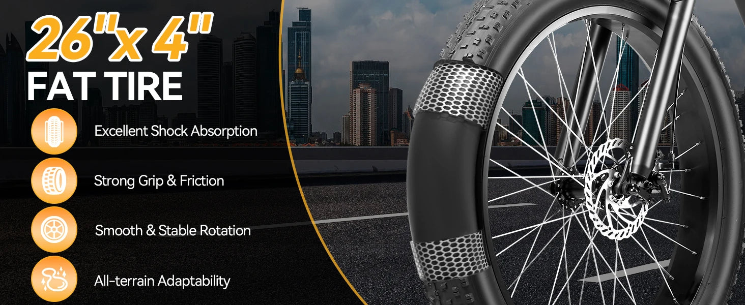 All-Terrain Performance: 26"x4.0" fat tires and a dual suspension system provide excellent grip and shock absorption, delivering a smooth ride on sand, snow, gravel, or pavement.