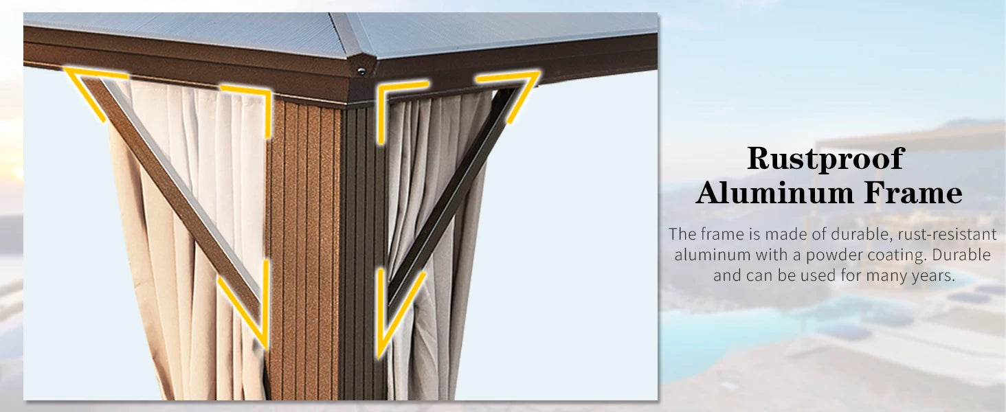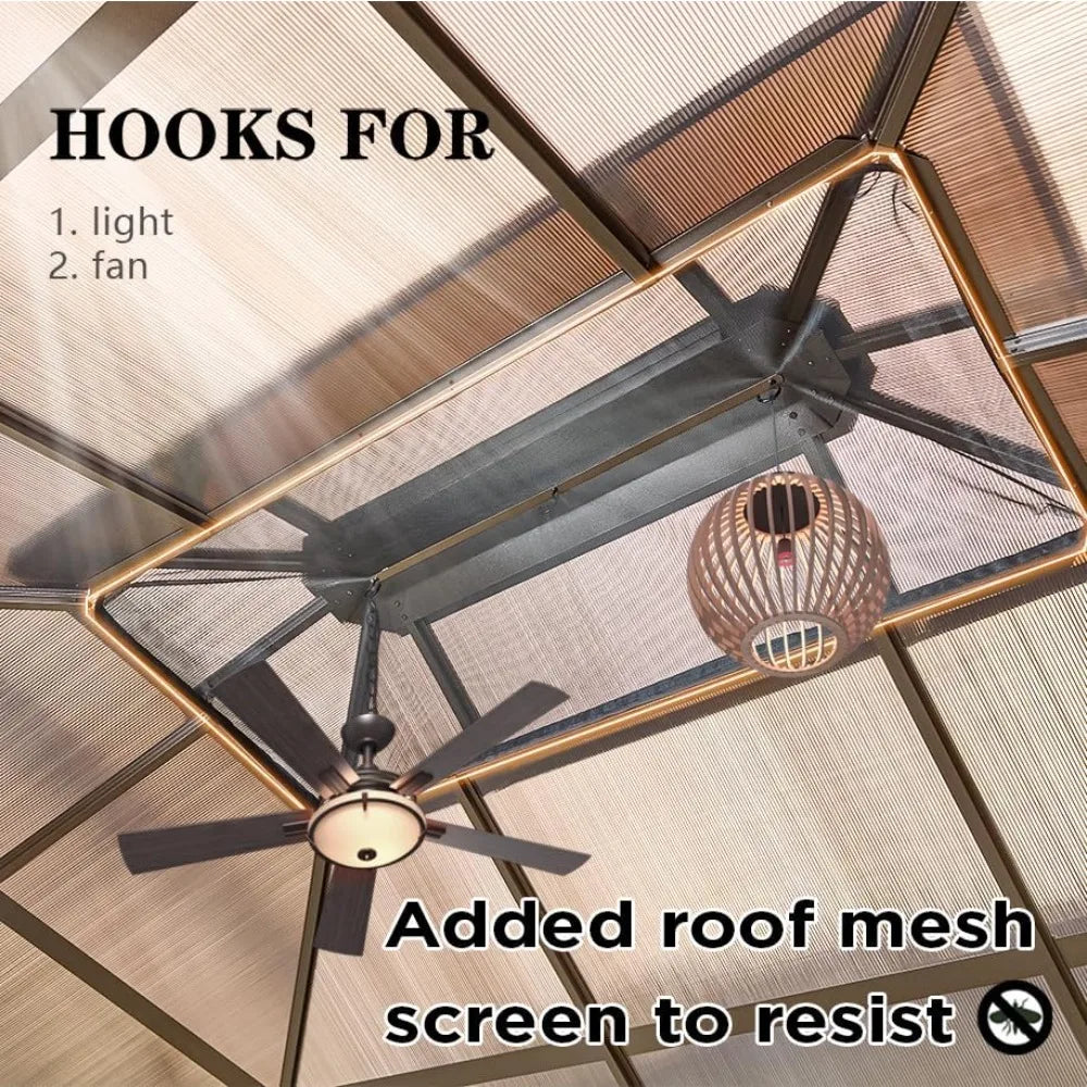- 𝗗𝗢𝗨𝗕𝗟𝗘 𝗧𝗢𝗣 𝗗𝗘𝗦𝗜𝗚𝗡: For fuller protection and fresher air, our patio gazebo features a ventilated, double-layer polycarbonate roof. It prevents harmful UV rays while allowing air circulation and helps withstand wind. You can sunbathe under this pavilion without worrying about getting sunburned. *Please note that the polycarbonate roof can only block UV rays, not high temperatures and strong light