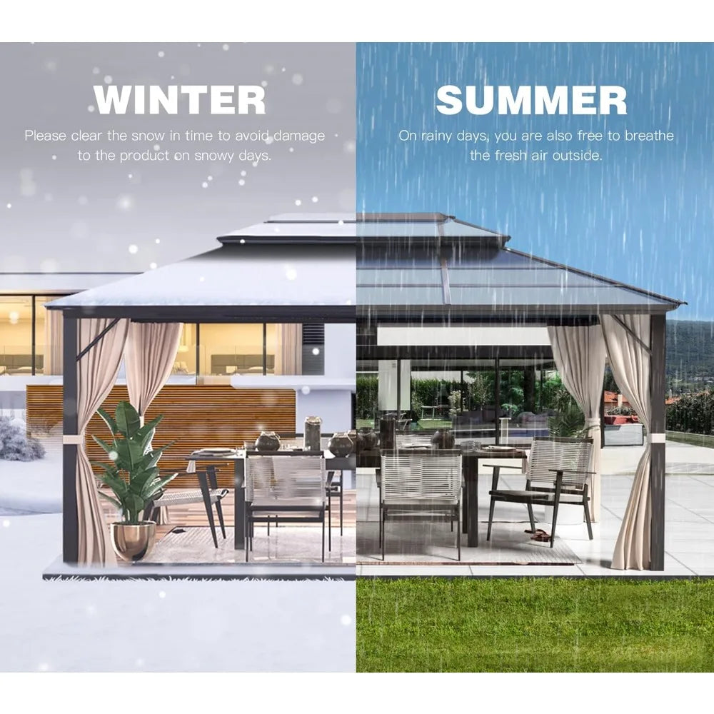 - 𝗜𝗡𝗖𝗟𝗨𝗗𝗘 𝗠𝗘𝗦𝗛 𝗖𝗨𝗥𝗧𝗔𝗜𝗡𝗦 & 𝗣𝗥𝗜𝗩𝗔𝗖𝗬 𝗖𝗨𝗥𝗧𝗔𝗜𝗡𝗦: The hardtop gazebo comes with a double-track system for easy sliding. Removable curtains ensure UV and rain protection, while the equipped mesh curtain with zipper keeps good ventilation. Let you enjoy great privacy while having full airflow and a wide view of the outdoors