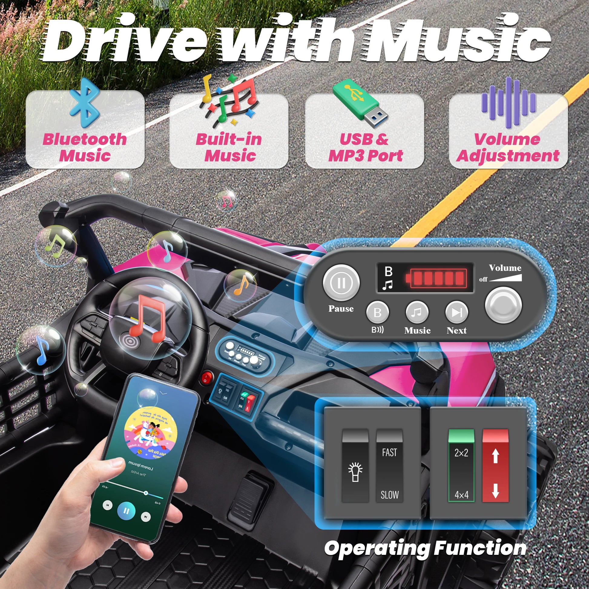 🚗Introducing the pinnacle of children's electric toy car – Joyracer 24V ride on toys redefine safety, comfort, and performance for young drivers everywhere. Designed with a spacious double-seat layout, this UTV offers ample room for two passengers. With its 24V 4*200W energy configuration, this four wheeler boasts unparalleled traction and stability, ensuring mastery over varied terrains with ease and confidence. Innovatively, the battery is strategically positioned at the front of the car, optimizing weight distribution and enhancing safety standards. Equipped with LED lights, USB/MP3 compatibility, and adjustable volume controls, this ride on car merges entertainment with practicality, offering an enriching sensory experience for young passengers.