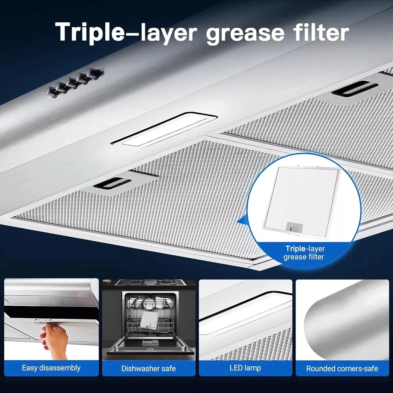 Features:Aluminum Grease Filter, Carbon Filter, Easy Clean, LED Light