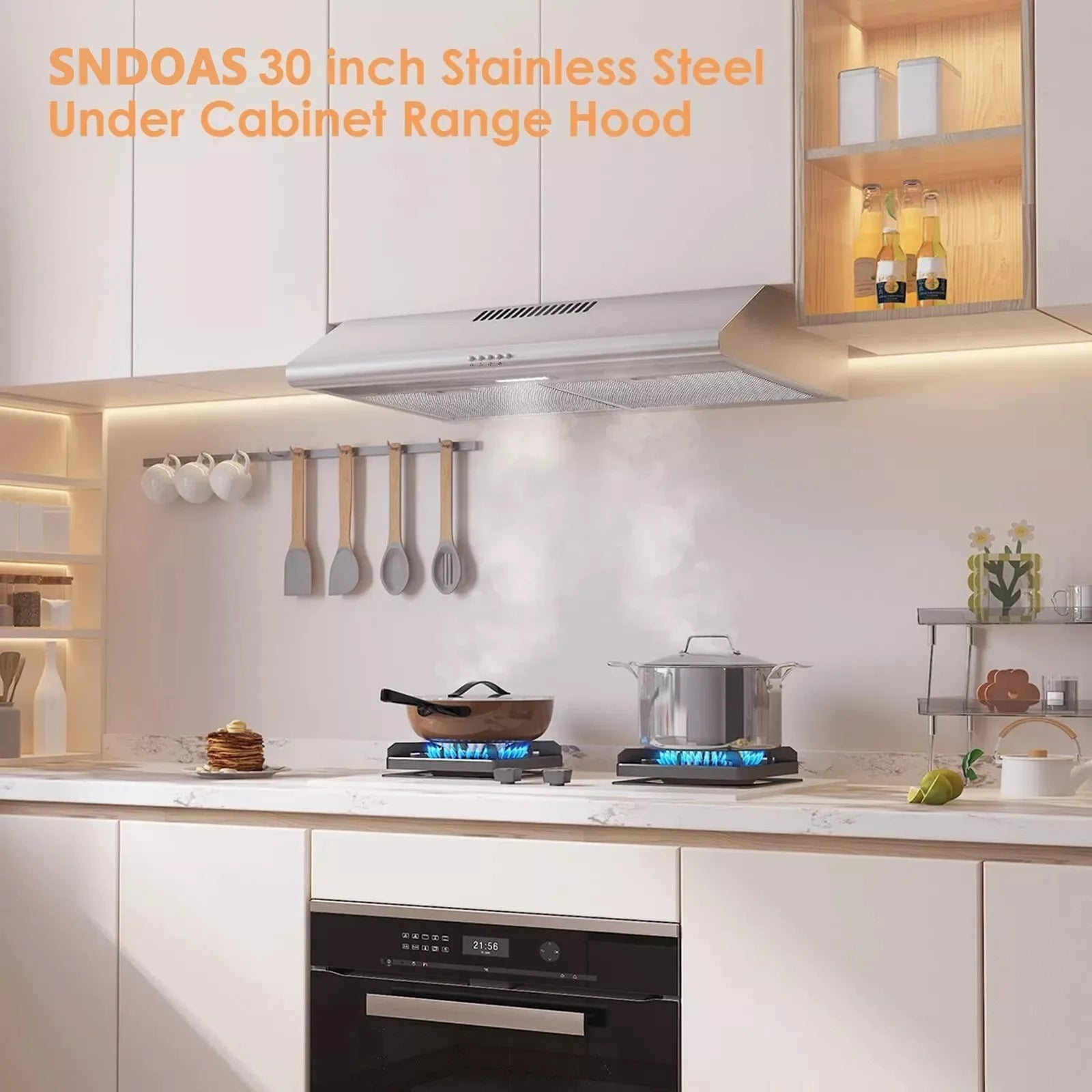 【Range Hood 30 inch Under Cabinet】Under cabinet range hood with slim design,saving your kitchen space.The back of the range hood is a little thicker than the front,stove hood is tilt slightly downward in the back after installation.This is a reasonable design, not a product defect. Please refer to the dimension drawing for details.