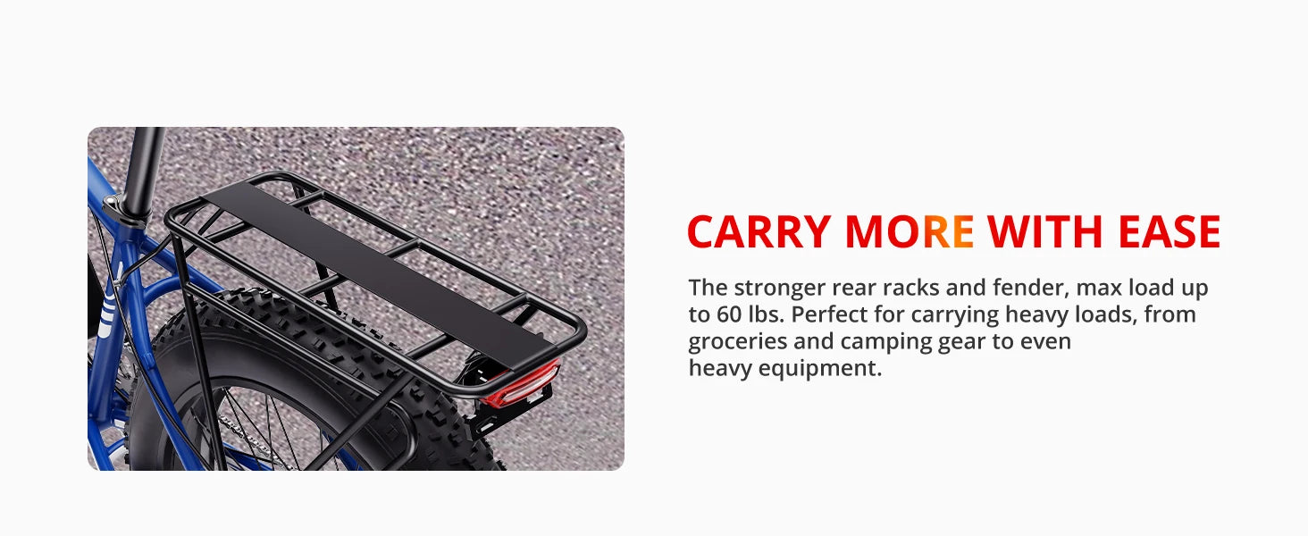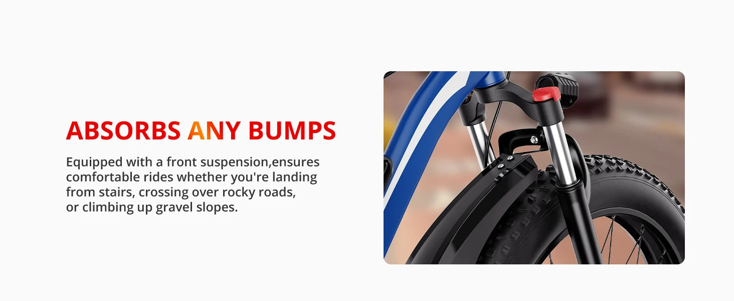 【26"&4" Fat Tire】EB26 Mountain electric bike With 26x 4-inch fat tires, it can traverse all sorts of terrain, including mountains, snow, beach, rocky roads, and even urban jungles. Lockable aluminum dual shock absorber for less bump on rough roads. The dual mechanical disc brakes deliver optimal durability and safety.