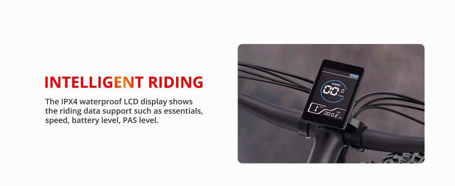 【Digital LCD Display】The LCD display EB26 electric bike has adjustable speed control from 1-5 levels which provides more powerful data support, such as power display, TRIP/ODO TIVOL/MAX/AVG SPEED, PAS mode, and cruise indicator. Equipped with a USB port to charge the phone.