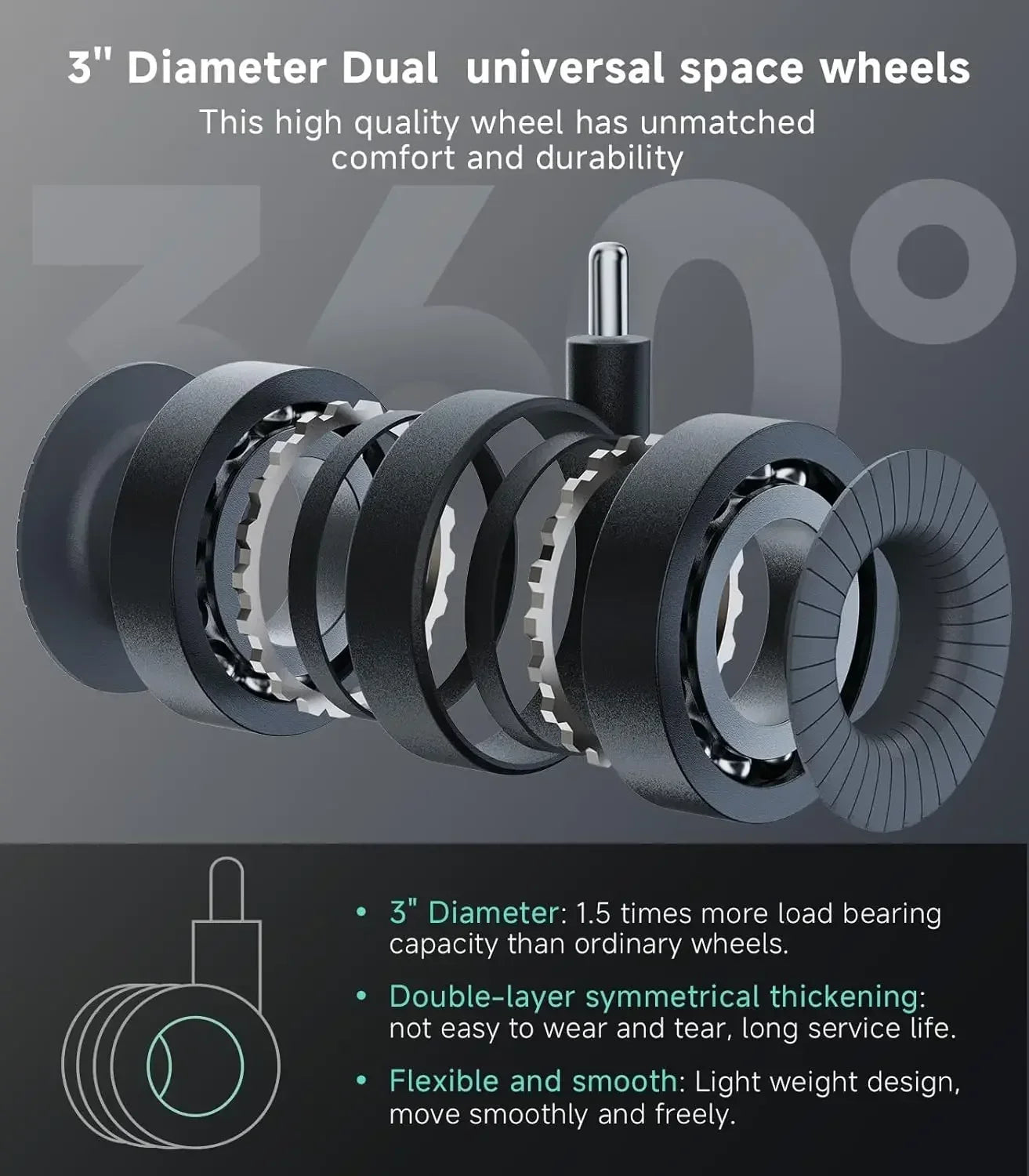 - 3. 3'' Large Diameter Space Wheels: The big and tall office chair wheels crafted with premium materials and exquisite craftsmanship. The high back office chair features 3'' large diameter space wheels. The wheels are double reinforced, ensuring durability and stability while maintaining flexibility. Whether used in an office or at home, they provide smooth and silent sliding, making every movement effortless and seamless