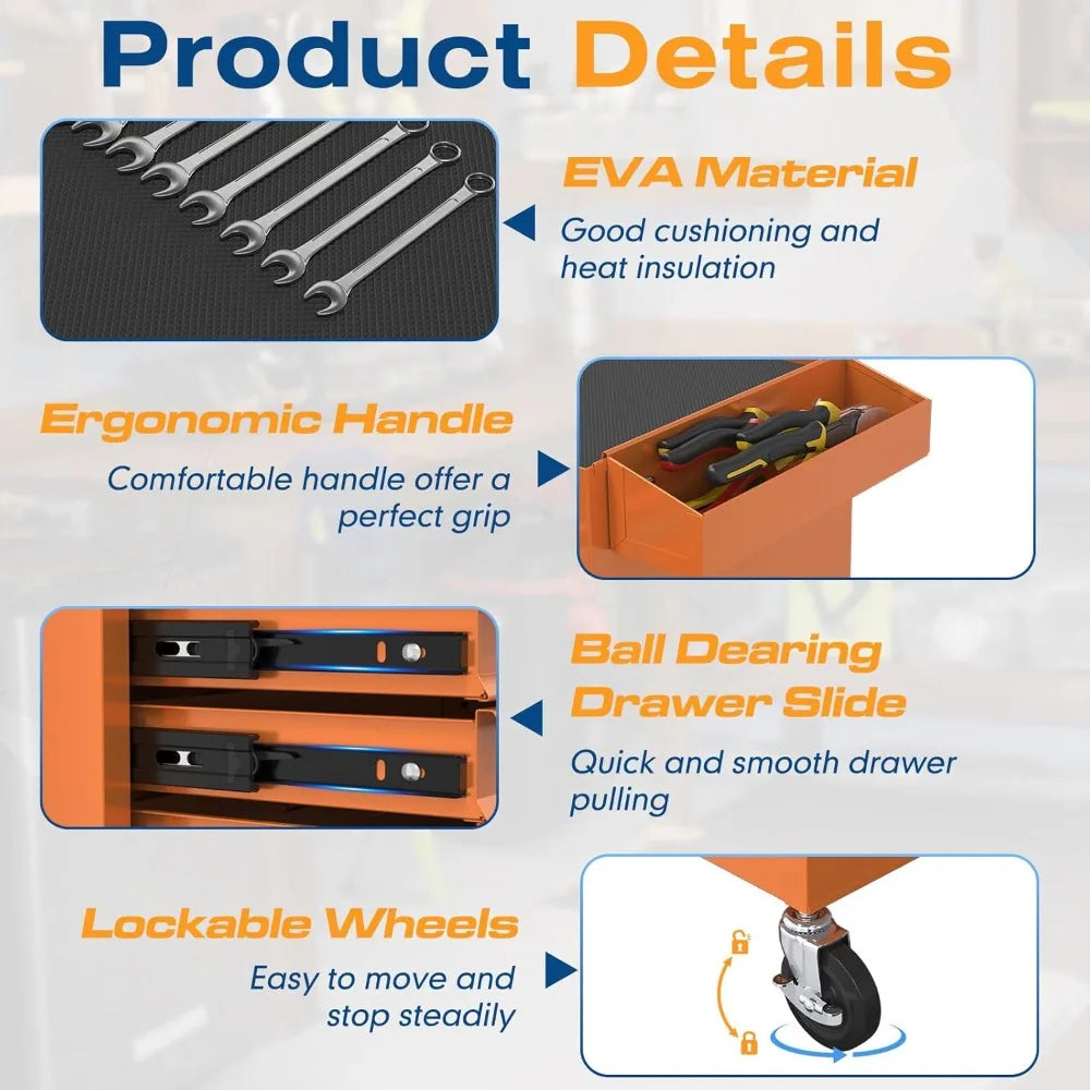 The tool chest features a removable top section with five drawers that can be detached from the rolling base, allowing you to transport the entire drawer unit to the worksite or use the mobile base independently for swift relocation, enhancing workflow efficiency. Equipped with four smooth-rolling casters for easy movement and stable operation, its reinforced all-metal construction provides a reliable, sturdy platform for heavy professional tools. The toolbox's five fully extendable drawers feature varying depths for categorized tool storage within easy reach, sliding effortlessly on smooth ball-bearing runners. The tool box handles and drawer operation are ergonomically designed, making installation straightforward and effortless, saving both time and labor. The tool chest's double-lock design offers enhanced security, and its robust metal construction ensures tools are stored safely, making it suitable for garages, tool sheds, workshops, and similar settings.