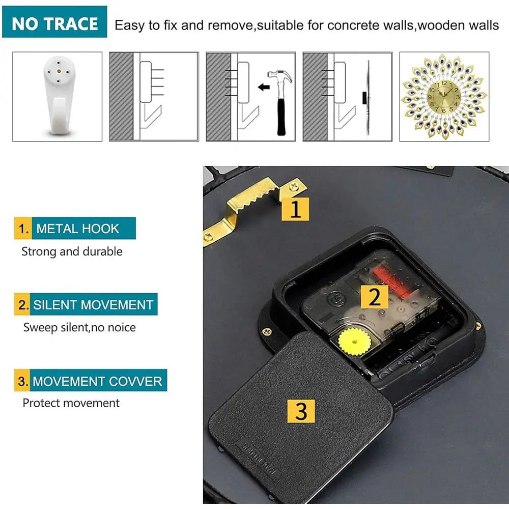 The clock operates silently, thanks to its high-quality quartz movement, ensuring a quiet environment without the ticking noise.