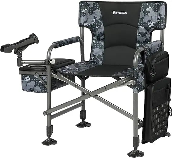 This product is an oversized fishing and camping chair, designed for comfort and durability. It measures 34 inches in width, 18.5 inches in depth, and 39 inches in height, making it ideal for taller individuals and suitable for a wide range of outdoor activities. The chair is constructed with steel tubes, ensuring sturdiness and the ability to support up to 350lbs. One of its unique features is the adjustable legs that extend to maintain balance on uneven terrain. The front legs have swiveling feet and wider chair feet that reduce pressure and prevent sinking into soft soil, adapting to various fishing environments. Additionally, it includes a detachable rod holder, which allows for hands-free convenience. The chair comes with an insulated cooler bag that keeps food and beverages cool for up to 12 hours. It features a cup holder and an access opening on top for easy placement of water glasses and retrieval of drinks. There is also a storage bag for organizing fishing gear and other essentials. The seat is fully padded, with a backrest and armrests, made from 420D Polyester fabric that is tough, breathable, and quick-drying. The chair is not only perfect for fishing but also for camping, barbecues, picnics, outdoor patios, balconies, lawns, backyards, and other social gatherings. This product is backed by a one-year warranty for any quality-related issues.