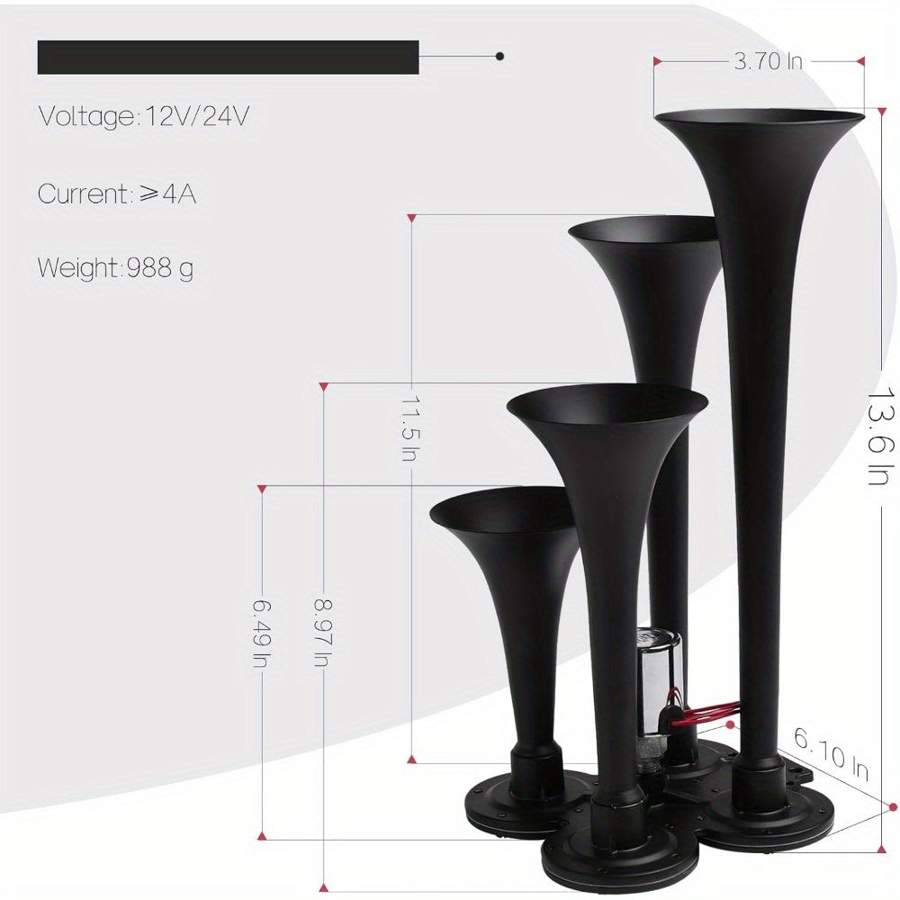 Details: DB Rating: 135DB Color: black Material: zinc aluminum alloy, chrome plated Item length: 18' Position on the vehicle: left side, right side Suitable for: cars, caravans, motorbikes, trailers, trains, trucks Package Contains: 1x 4-horn train air horn (black) 1x 12V/24V Electric Air Valve (Solenoid) 1x Mounting hardware kit