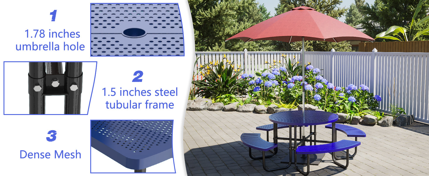 Tabletop features an umbrella hole to accept an umbrella with a pole of up to 1.77" diameter