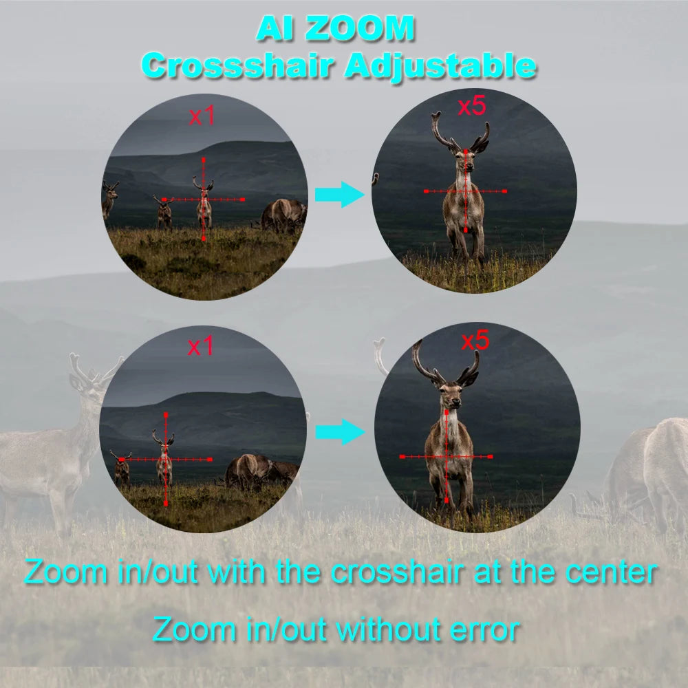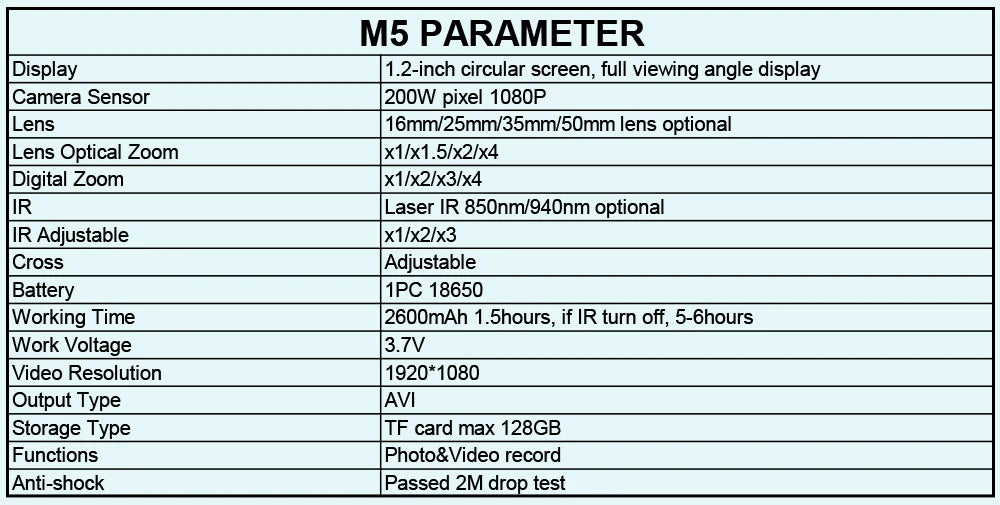 2, CLEAR VISION DAY AND NIGHT: M5 Digital Night vision scope features 2MP FHD 1080P CMOS sensor, 50mm large objective lens, 4x magnification + 4x digital zoom, built-in 850nm laser IR illuminator with 3 gears IR levels adjustment enable to observe animals more than 3280ft/1000m at daytime, up to 1310 ft/400m in complete darkness, clearly at night. You can view full HD image directly on the large eyepiece.