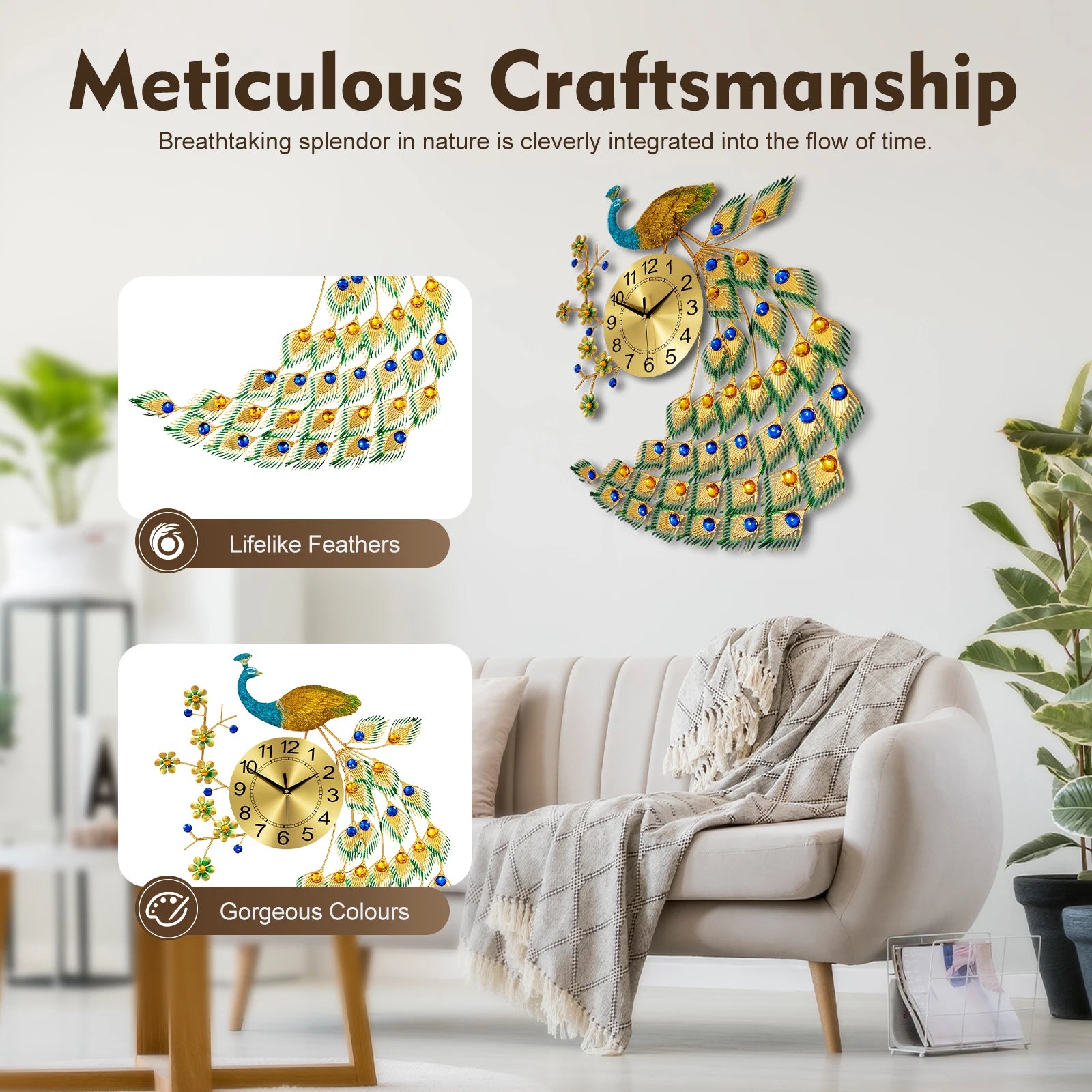 This peacock wall clock is praised for its quality materials, high performance, and premium movement. With its exquisite design, it is not only a timekeeper but also a bright addition to your interior decor. Hanging it quietly on the wall not only makes every glance up a feast for the eyes but also reminds us that every second of life is worth cherishing and experiencing in the most beautiful way.