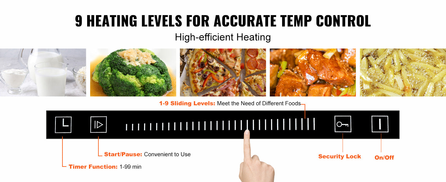 Digital Sensor Touch Controls: Our built-in electric stovetop has 9 heating power levels. With a temperature control, it allows you to precisely switch into different levels from boil to simmer. In addition, the 1-99min timer is equipped, making cooking easy and enjoyable. Set the power and timer and let the cooktop do the rest. This sensor touch control panel is ideal for achieving accurate cooking effects.