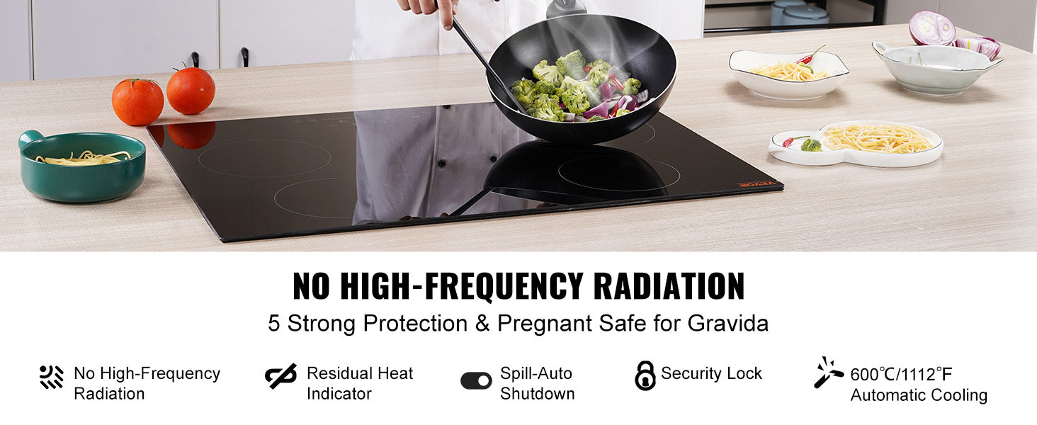 Multiple Safeguard Functions: This electric stovetop contains various functions for enhanced security. The child security lock avoids accidental touching, while the overheat protection and auto shut-off function keep you from unexpected dangers. No high-frequency radiation allows you to use it with confidence. In addition, when high heat remains on the surface, the residual heat reminder will indicate you, averting hand scald during cleaning.