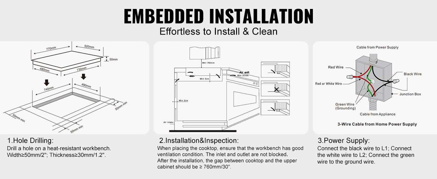 Built-in Design: With the 23.2x25.6-inch cutout size, this 23.2x20.5 inch cooktop adopts a built-in design, convenient for you to install and saves your kitchen space. Suitable for voltages of 220-240V/110-127V, 50/60Hz.