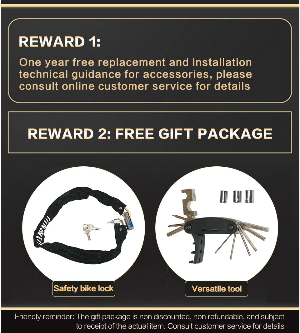 Package included: Electric Bicycle, Power Charger, Safety Lock, Tool