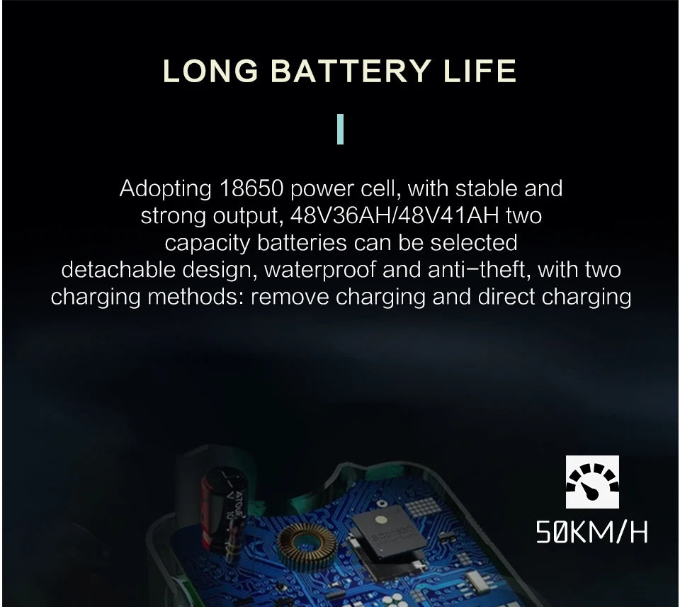 Max Range: 48V 41AH--120KM (depends on the weight, speed, road condition and Weather. Test made on rider's weight of 50kgs)