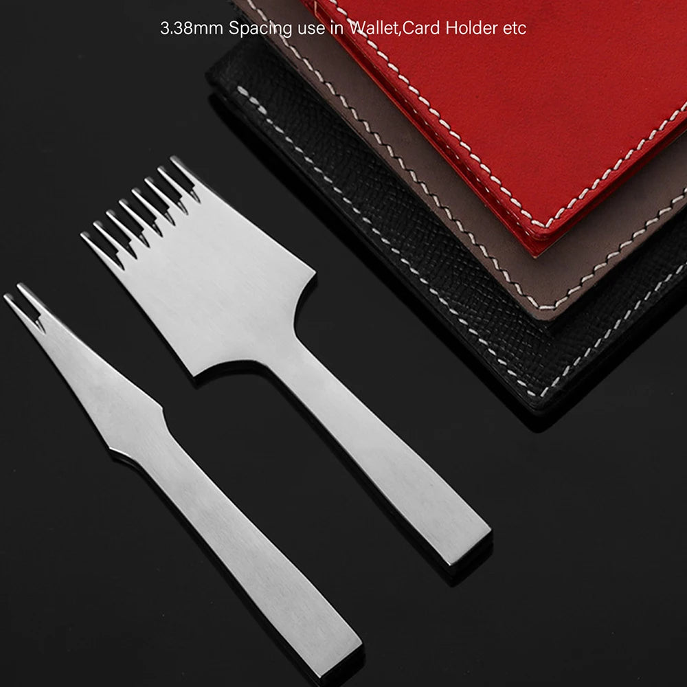 3.Since the French style pricking iron is a professional tool with "V" taper teeth, that means each teeth are wide at the top and narrow at the bottom, although 2 teeth and 8 teeth width are the same, the force applied will also affect the size of the hole. Since the leather cut by the 2-teeth is smaller, it is sharper, so please control the force to be smaller when use 2 teeth. Otherwise, the 2-teeth will be easy to make a deeper, and large holes. So if the first time use this professional tool, please control the strength and practice more, then you could make even holes.