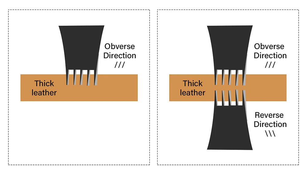 When you punch more than 3mm thick leather, please punch separately with obverse and reverse direction to ensure beautiful stitches. and please straight pull out ,don't pry to both sides.thanks.